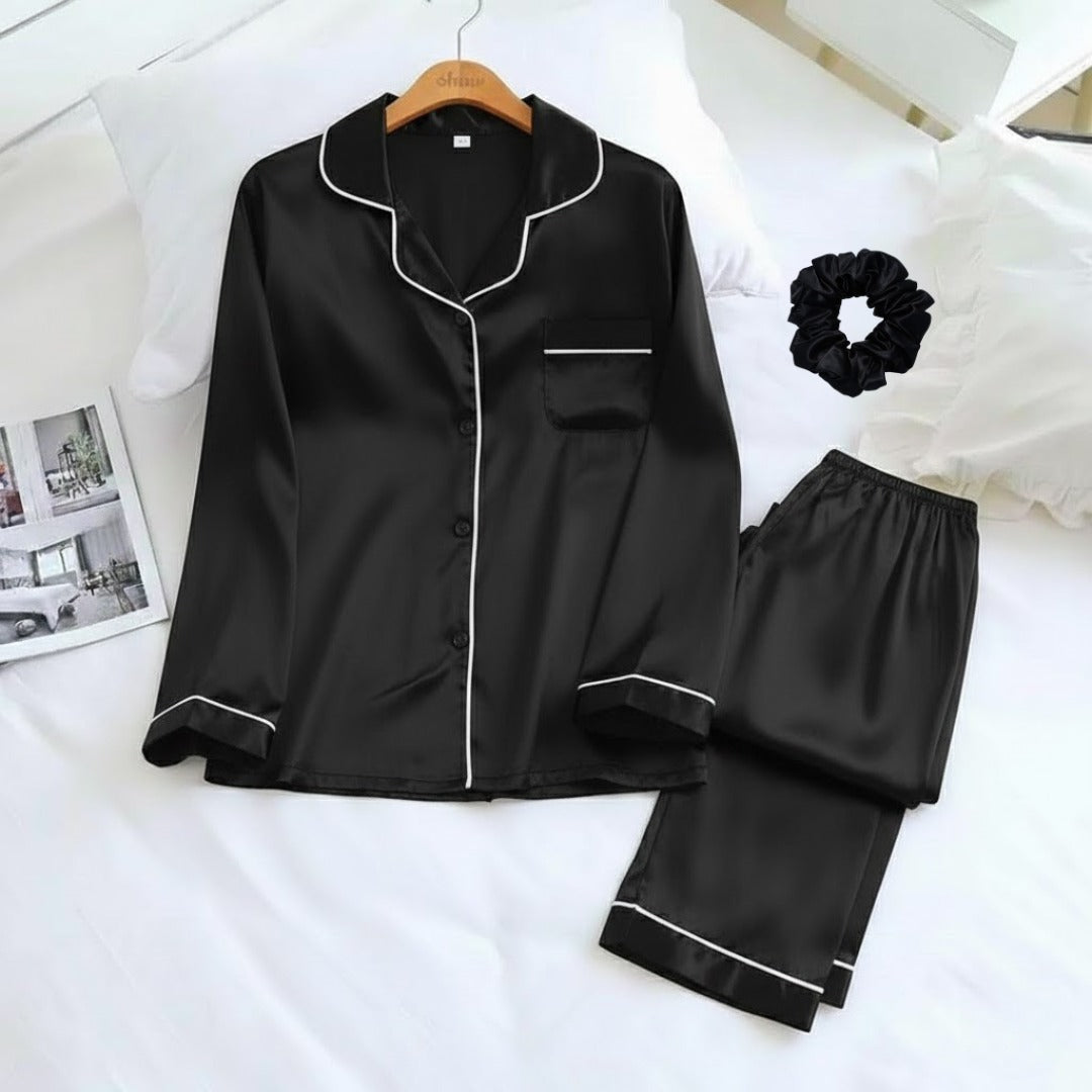 Luxury Silk-Feel Satin Night Suit with Matching Scrunchie